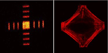Fluorescence microscopy (right) image depicting a cell (actin fibers labelled with rhodamine appear in red) attached to a cell-adhesive pattern, the ToF-SIMS image of which is shown on the left. Courtesy of R. Michel and J. Lussi (ETH Zurich). See the abstract of Michel et al. for more information. |