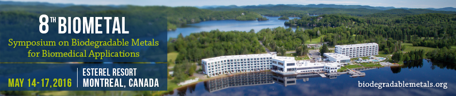 Following the successes of the past 7 editions, we are proud to introduce the abstract book of the 8th Symposium on Biodegradable Metals, which was held in L’Estérel resort, in Laurentide region, 75 km North of Montréal , from Saturday May 14 to Tuesday May 17, 2016. This year again, the onsite symposium emphasized its academic-conference-style with an openly discursive format, rather than a lecture and question–answer format. This style was completed by the traditional discussions and the unconventional daily free-time sessions early in the afternoon. Behind the presentations, this symposium aimed to discuss open questions on the session topics, new approaches, background knowledge, and personal views among the participants. Furthermore, discussions at the poster session were focused on specific topics and will encourage the participants to raise critical questions or help each other advancing the field of biodegradable metals. |