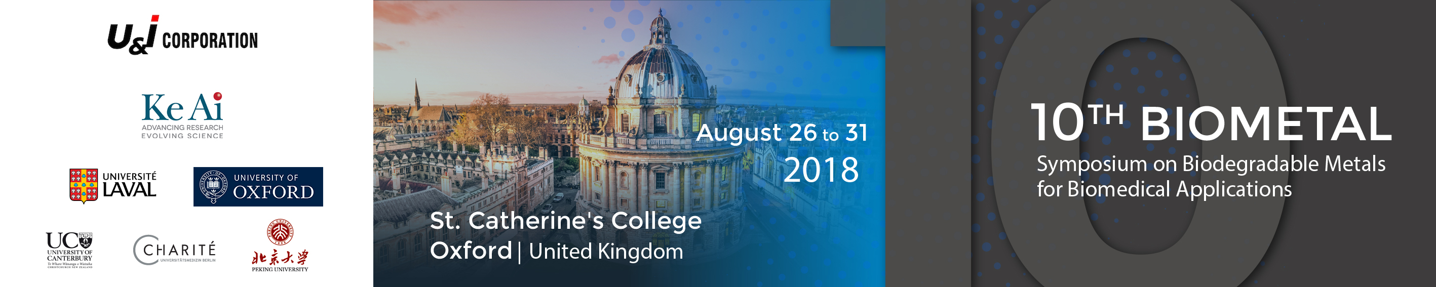 Following the successes of the past 9 editions, we are proud to introduce and welcome you to the 10th Symposium on Biodegradable Metals in Oxord University, England from Sunday August 26 to Friday August 31, 2018.