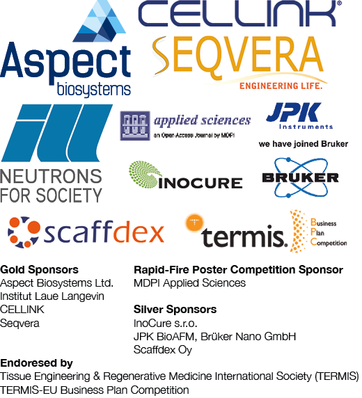 Another important aspect of the conference is the inclusion of industrial partners, not only through an exhibition, but also as integral contributors to our programme. This conference is sponsored by Aspect Biosystems Ltd. (Gold Sponsor), CELLINK (Gold Sponsor), Institut Laue Langevin (Gold Sponsor), Seqvera (Gold Sponsor) and MDPI Applied Sciences (Rapid-Fire Poster Competition Sponsor), JPK BioAFM, Brüker Nano GmbH (Silver Sponsor) and Scaffdex Oy (Silver Sponsor), InoCure s.r.o. (Silver Sponsor) and endorsed by Tissue Engineering & Regenerative Medicine International Society (TERMIS) and TERMIS-EU Business Plan Competition & Pre-Accelerator Programme.